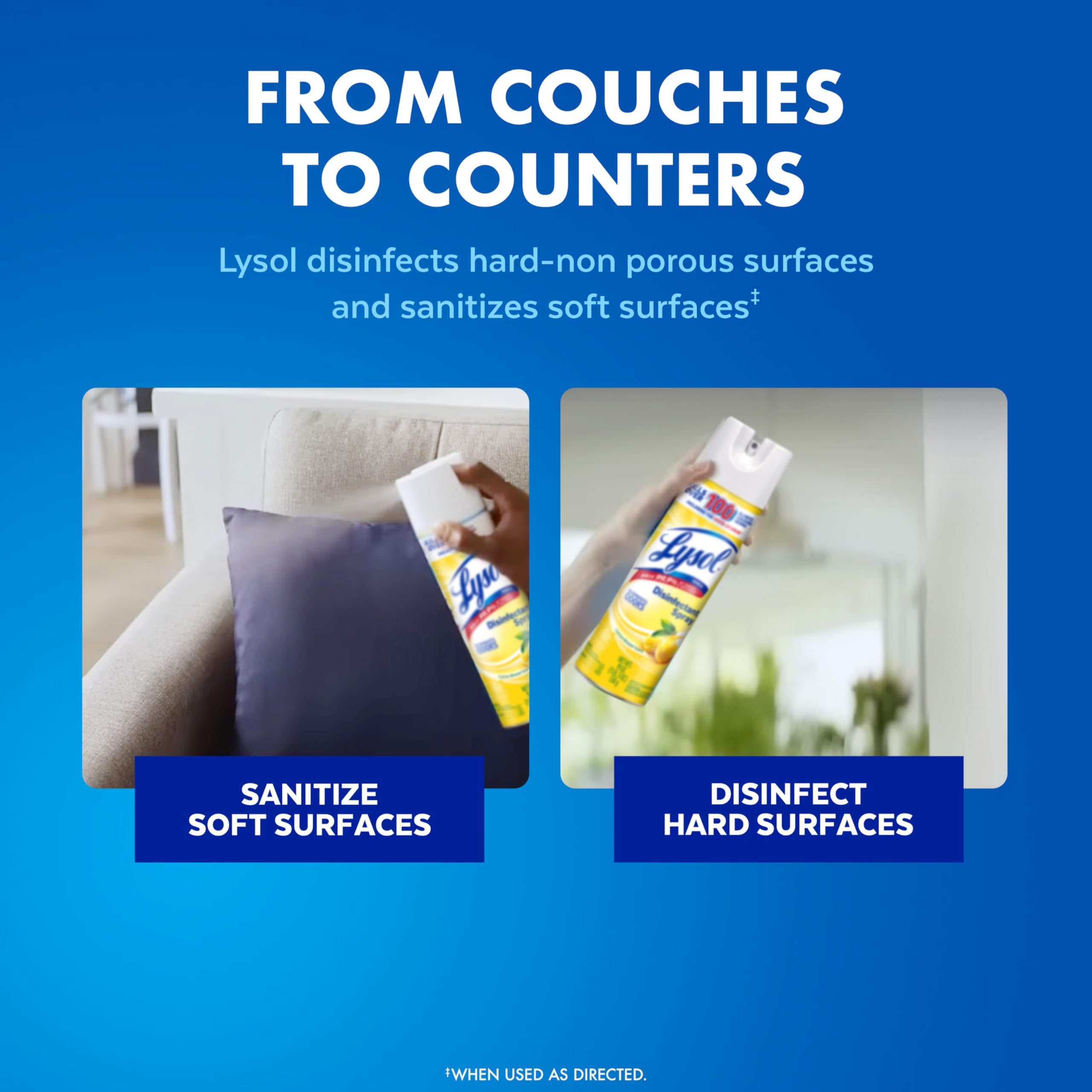 - DISINFECTING AND SANITIZING SPRAY: Lysol disinfects hard non-porous contact surfaces and sanitizes soft surfaces. This multi-purpose spray can be used in the home and kitchen, to disinfect kids toys, couches, counters , bathrooms, and over 100 more surfaces.
